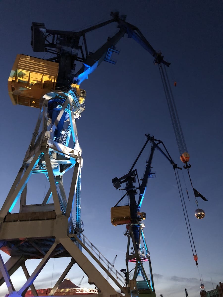 Was habe ich aber angesehen? Fangen wir am Freitag an. In Hamburg angekommen, sind Simon und ich gemütlich mit der S-Bahn bis zu den Landungsbrücken gefahren, durch den Alten Elbtunnel gelaufen und haben gegen 16:30 Uhr ohne groß Anstehen bei Blohm+Voss unsere Bändchen und Sitzplatztickets für unser Elbphilharmonie-Konzert am Samstag abgeholt. Perfekt, um uns noch etwas auf dem Gelände zu aklimatisieren und anzuschauen, wo welche Bühnen und Stände sind. Dieses Jahr auch wieder als Begleiter dabei: Niels, der mich schon 2012 fotografisch übers Elbjazz begleitete und auch seitdem dem Festival treu ist.